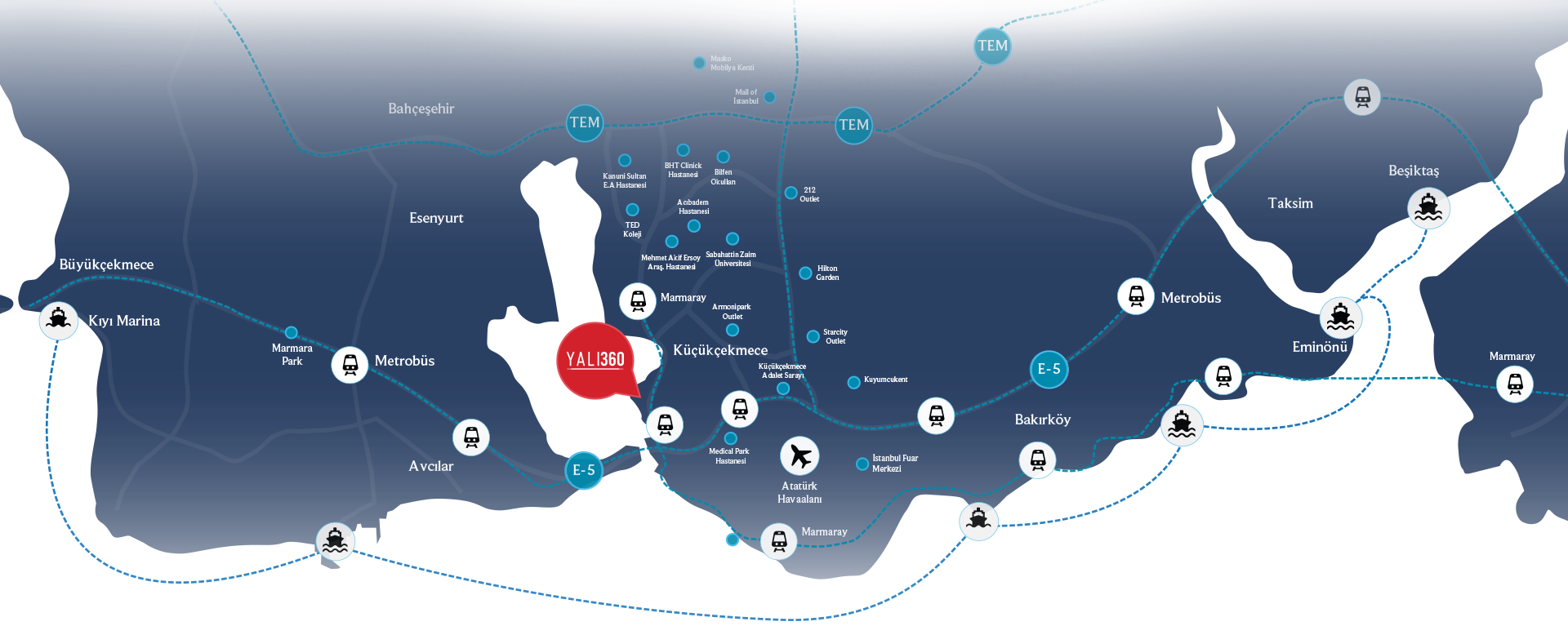 Küçükçekmece Gölü’nün hemen kıyısında konumlanan Yalı360, ulaşım ağlarının merkezinde yer alıyor. Marmaray hattına birkaç adım mesafedeki bu özel proje, metrobüs ve ana bağlantı yollarına yakınlığı sayesinde İstanbul’un her noktasına kolay erişim imkânı sunuyor.